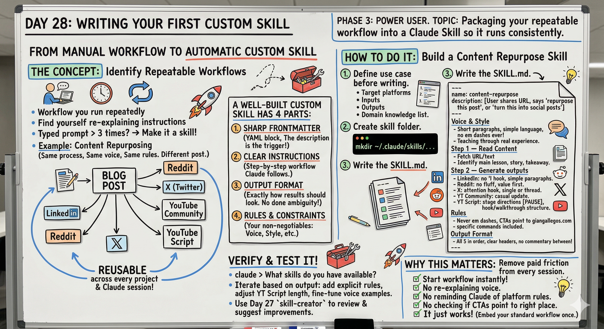 Build custom Claude Skills for repeatable workflows. Content repurposing example. Sharp frontmatter, clear instructions, output format, rules. Use everywhere.