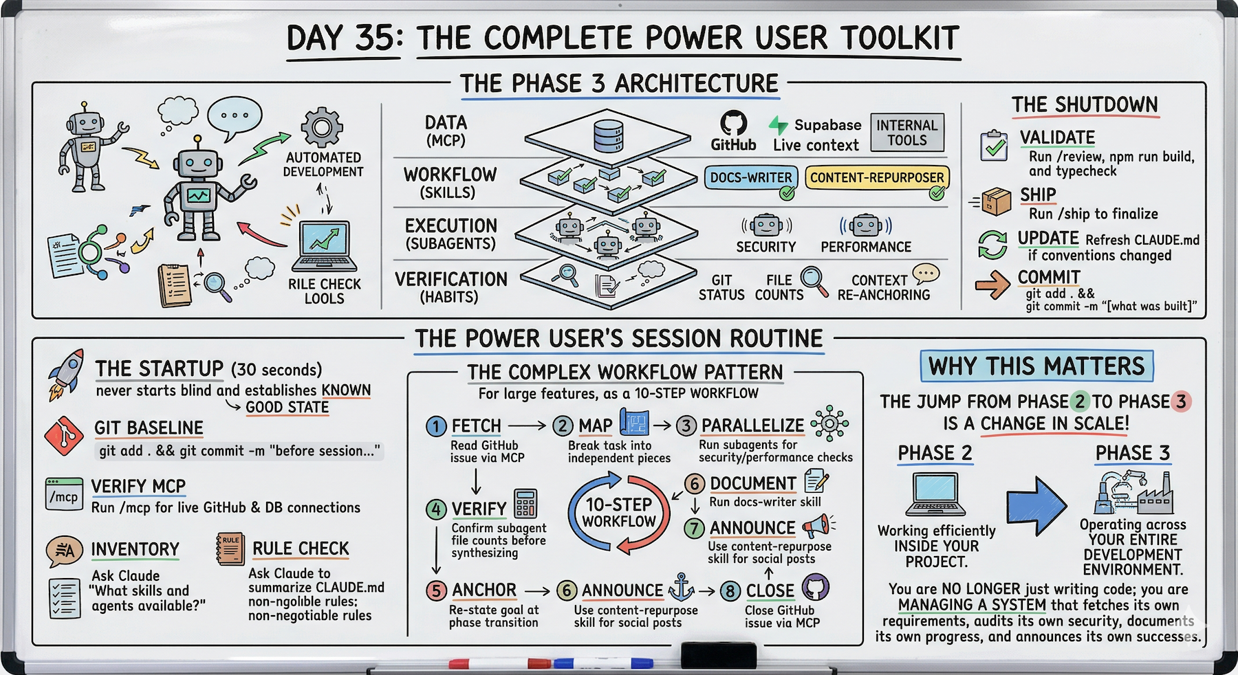 Day 35 is a multi-layer system with live data connections, packaged workflows, parallel agents, and debugging habits.