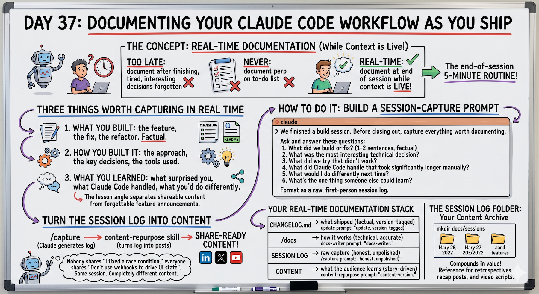 Capture process in real time while Claude has context. Session documentation → docs + content. Memory fades. Details matter. 60-second prompt changes everything.