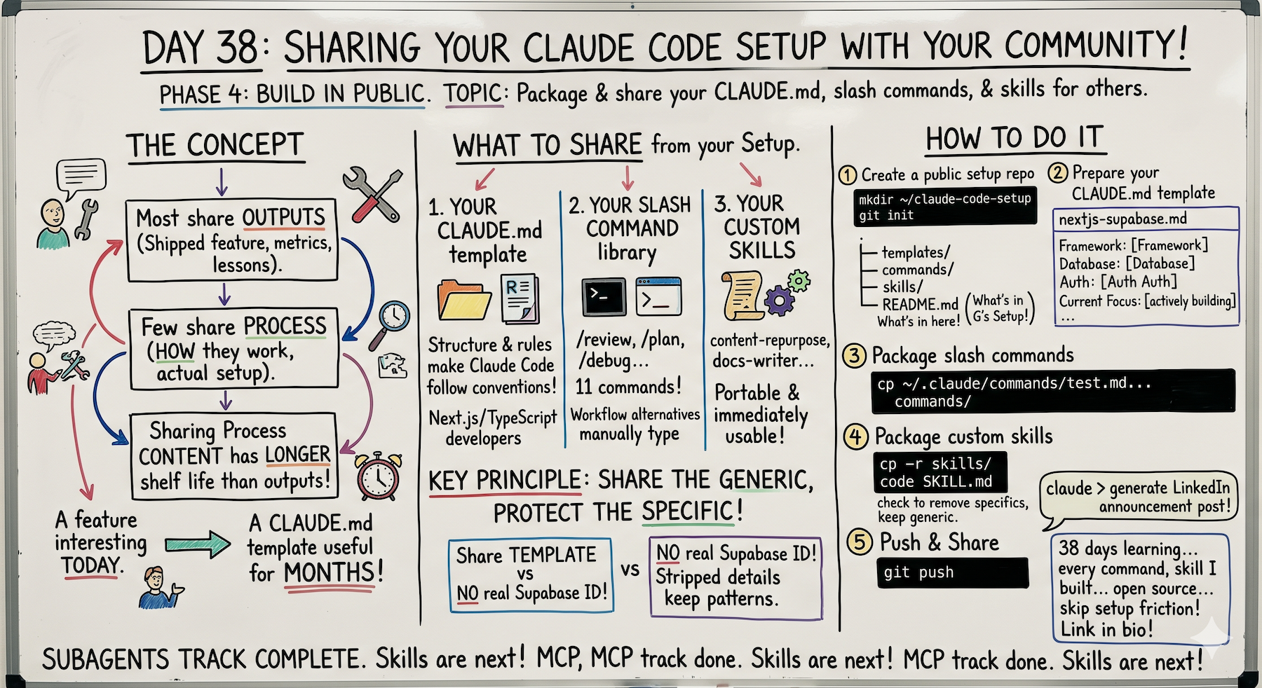 Open source your Claude Code setup. CLAUDE.md templates, slash commands, custom skills. Share the generic, protect the specific. Process over outputs.