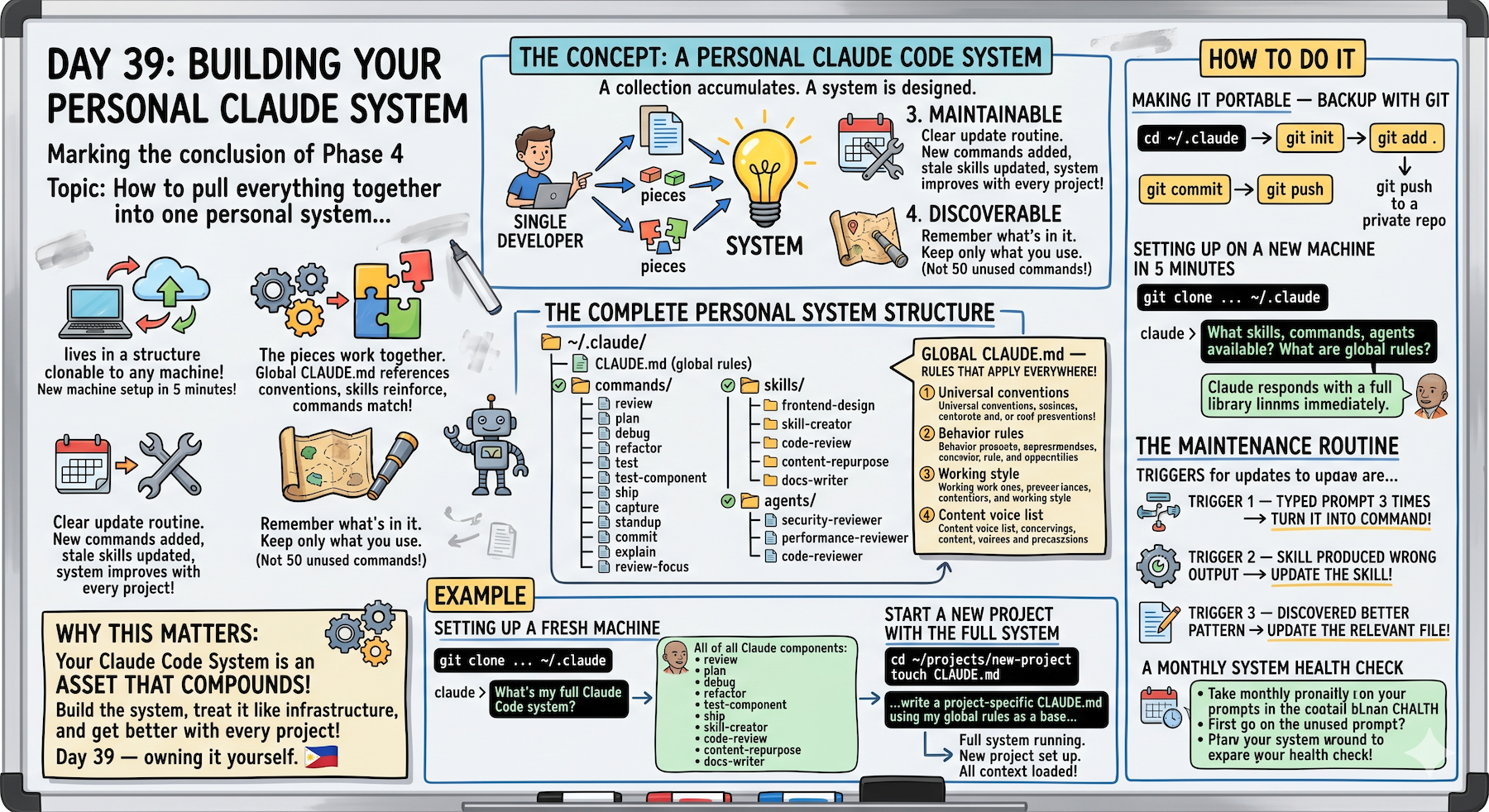 Portable, composable, maintainable system. Global CLAUDE.md. Version control. 5 minutes from fresh machine to full setup. Infrastructure, not files.